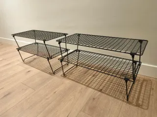 Práctica estantería de metal con dos niveles. Ideal para organizar zapatos o cualquier otro objeto. Se venden las 4 unidades por 12€. El precio de cada una es de 3€ - Diseño de rejilla. - Patas plegables para fácil almacenamiento. - Módulos apilables