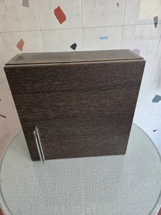 Mueble colgante con un diseño moderno y funcional. Bastante cuidado. - Estructura de madera oscura. - Detalles en metal plateado. - Tres estantes interiores para almacenamiento. Trato en mano. Precio no negociable.