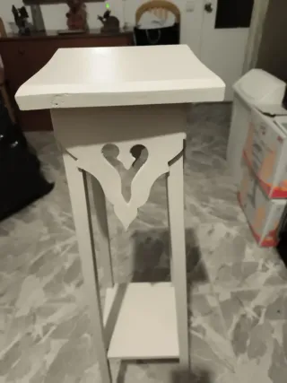 Elegante macetero alto con un diseño decorativo en forma de corazón. - Fabricado en madera. - Acabado en color blanco. - Incluye un estante intermedio. 94 cm de alto 19 por 19 cm de base
