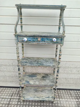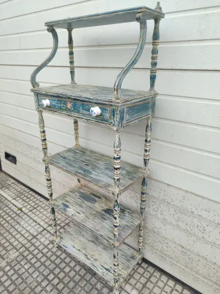 Estantería de estilo Shabby Chic. Diseño de tres estantes, cajón central con tiradores decorativos. Columnas y patas torneadas con detalles. Acabado pintado a mano con efecto envejecido/desgastado en azul turquesa y beige. Mira en mi perfil más mobiliario y artículos de decoración de diseño vintage antiguo retro nórdico industrial art deco utilizados como atrezzo props en películas teatro fotografía escaparates eventos stands. No hago envíos por la App posibilidad de transporte por mis medios o envie usted agencia. También disponible en alquiler.