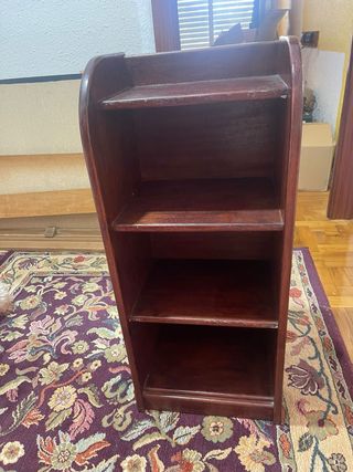 Mueble auxiliar de madera con un diseño elegante y funcional. Con algún signo de uso, tiene una mancha blanca difuminada en la parte de arriba foto 6 y algún pequeño rallon por la parte de abajo foto 7 apenas se aprecian. Se puede ver sin compromiso. No hago envíos del mueble. - Dos estantes para almacenamiento. - Un cajón con tirador dorado. - Patas torneadas. Medidas ancho 35 largo 57, alto 76.