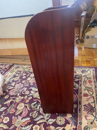 Mueble decorativo de madera con diseño clásico y acabados ornamentales. Ideal como complemento para salones, recibidores o como pieza de decoración. Incluye un grabado decorativo en la parte frontal y un estante inferior.