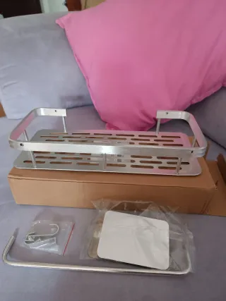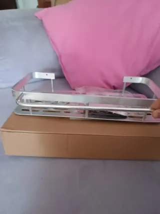 Estante de pared para baño con un diseño moderno y funcional. Ideal para organizar tus productos de aseo. - Fabricado en metal resistente. - Acabado plateado brillante. - Diseño con bordes elevados para mayor seguridad. - Está sin estrenar y viene para colgarlo