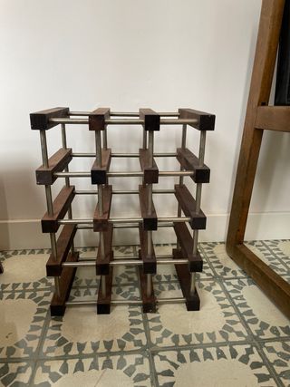 estanteria para botellas de vino Habitat, pero se le puede dar otros usos. Botellero de madera oscura y acero inoxidable. medidas: 31.5 cm 41 cm #estanteria #estiloindustrial #madera #metal #botellas #salon #recibidor #modernista #vintage #