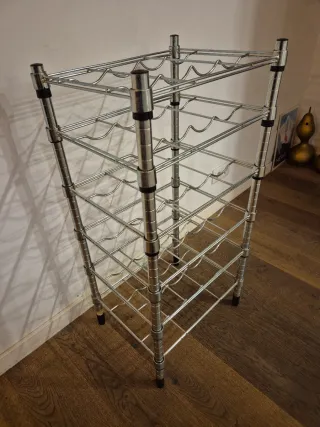 Elegante botellero con un diseño moderno, perfecto para almacenar tus botellas. - Capacidad para 18 botellas. - Estructura resistente. - Acabado plateado brillante. SE VALORAN OFERTAS