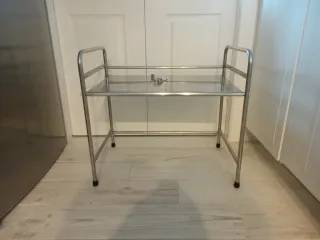 Preciosa estantería auxiliar de acero inoxidable, ideal para cualquier estancia. Se encuentra en muy buen estado. Se puede usar de mesita auxiliar. ARAMIS/ARA MIS Home. - Dos niveles de almacenaje, alturas co figurables. - Estructura resistente y ligera. - Cuatro ruedas para facilitar su movilidad, dos de ellas con freno. Medidas montado (cc): 60x45x45. Medidas de envío (cc): 64x48x10.