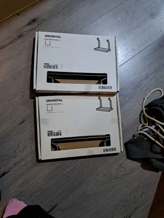 Estante Grundtal de IKEA, diseñado para colgar. Nuevo a estrenar, embalaje sin abrir. Los vendo porque nunca llegué a poner los rieles (que también los tengo disponibles) Hecho en Acero inoxidable, perfecto para tener más espacio en sitios pequeñitos. Precio: 1 x 8€ 2x 12€