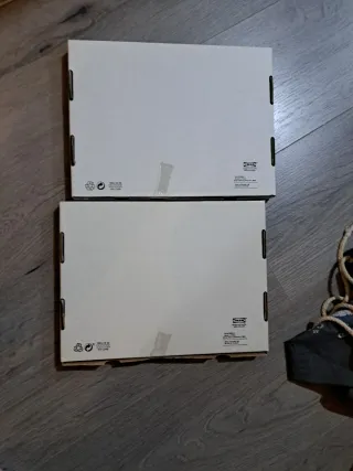 Dos apliques para estanterías o librerías, en acero inoxidable, marca Grundstal de IKEA, ya descatalogados, nunca usados. Sin cables ni transformadores, en su envase original, bombilla incluida e instrucciones de montaje. El precio es por los dos. Entrego en mano.