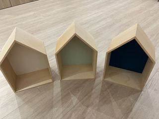 Conjunto de tres estanterías con forma de casita, de la marca Banak. Perfectas para habitaciones infantiles. - Fabricadas en madera. - Diseño de casita. - Traseras de diferentes colores: blanco, verde y azul marino.