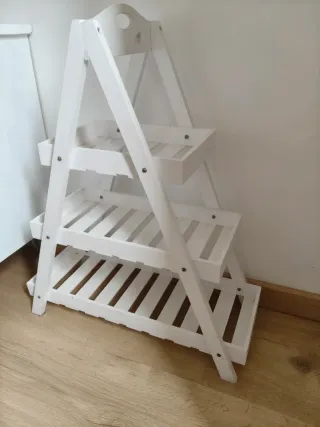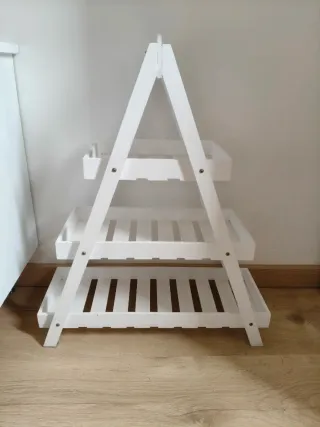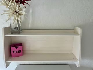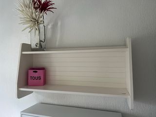 Estantería decorativa de madera en color blanco con acabado envejecido, perfecta para dar un toque acogedor al recibidor, salón o incluso al baño. La vendo por mudanza. - 3 niveles para colocar marcos, plantas, llaves, etc. - Diseño versátil para espacios pequeños. - Estética artesanal estilo "shabby chic" / nórdico / rústico. - Estado: bien conservada y estable. Se entrega limpia (objetos decorativos no incluidos). Se pueden negociar packs con otros anuncios de mi perfil.