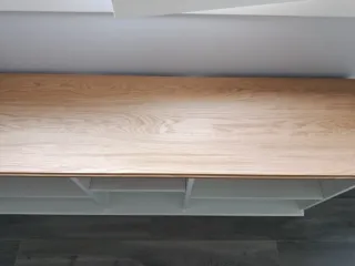 Estantería con diseño de escalera, combinando tonos de madera y blanco. Cuenta con varios estantes y un módulo inferior con cajones. - Diseño moderno y funcional. - Módulo inferior con dos cajones. - Estructura de madera y estantes blancos. Es recién comprada, no era exactamente lo que buscaba, la hemos montado, vien con una pequeña mancha transparente que se puede ver en la foto pero casi no se aprecia. Es perfecta para ponerle un cojín y que tu gato pueda tumbarse mientras estudias o trabajas.