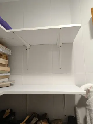Estanterías de madera reforzadas, con un diseño moderno y elegante. Tienen pegatinas, se pueden quitar. Algunas estan dobladas con defecto. 10€ por estanteria. - Color blanco. - Material de madera.