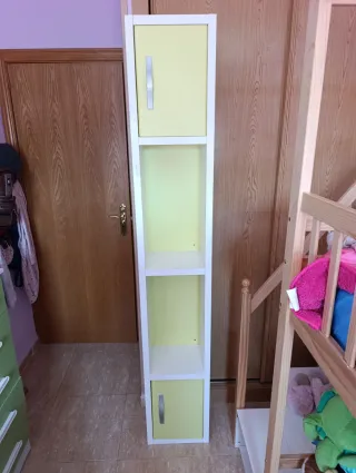 Estantería de color blanco con puertas en la parte inferior. Cuenta con cinco espacios separados por cuatro baldas, la última de ellas en la parte inferior que cuenta con puerta. Se encuentra en buen estado. Dos estanterías se venden por 55 euros y una por 35 euros - Diseño moderno y funcional. - Amplio espacio de almacenamiento.