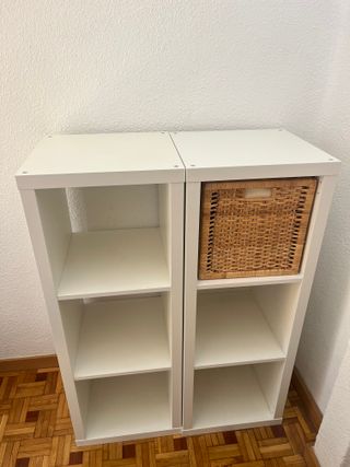 Conjunto de dos estanterías KALLAX de IKEA. Una estantería de dos cubos y otra de un cubo. A simple vista estan en muy buen estado pero si te acercas se aprecian marcas de uso, seguramente blanqueables. Algunas son de haber estado en el suelo varios años y otras de haber tenido tiras led pegadas. Adjunto 3 imagenes de ejemplo.