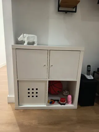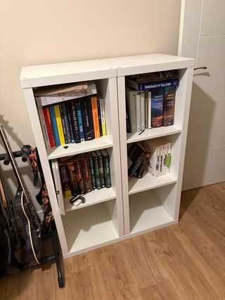 Estantería modular de Ikea con compartimentos. Tiene hechos unos agujeros que fueron para poner una tira de luz led. Queda muy chula asi si quieres ponerlo. Tengo 2 asi. Cada una suelta 75€ o las 2 por 130€