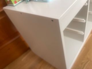 Estantería blanca para organizar juguetes y libros. Tiene 3 meses de antigüedad, sin arañazos ni daños. - Diseño moderno y funcional. - Múltiples compartimentos para almacenamiento. - Incluye cubos de tela.