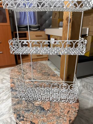 Elegante estantería de metal con un diseño decorativo. - Tres niveles para organizar tus objetos. - Acabado blanco que combina con cualquier decoración. - Estructura metálica resistente y duradera.