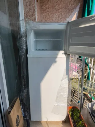 Frigorífico blanco con congelador superior. Ideal para espacios pequeños. Altura 145cm, ancho 55cm, 212L. Puertas reversible con apertura flexible. Estanterías de cristal. Puerta superior para congelador.