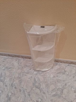 Estantería de plástico para baño, de color blanco, ideal para organizar tus productos. Es de forma curva y se instala en la pared. - Tiene dos estantes y un cajón. - Perfecta para espacios pequeños. - Se encuentra en buen estado.