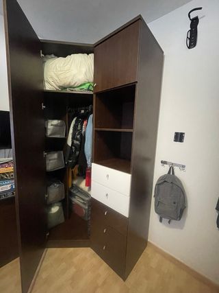 Mueble de esquina modular de color marrón oscuro y blanco. Ideal para optimizar el espacio. Se regala el escritorio y la cama si alguien la quiere aunq está roto el mueble de la cama por un lado , habría que soldarla o ponerle un somier de patas . lo hablamos si te interesa - Diseño moderno y funcional. - Combinación de puertas y cajones. - Estanterías interiores. No está nuevo pero sí que a sido cuidado , podeis ver en las fotos .