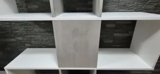 Estantería de diseño moderno, ideal para salón o comedor. Combina a la perfección con diferentes estilos decorativos. - Acabado en blanco y gris cemento. - Diseño modular. - Medidas : 145cmX145cmX28cm - Nueva a estrenar. - Montamos y no nos cabe con esas medidas y no se puede devolver al no tener la caja.