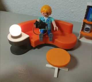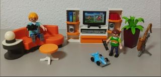 Conjunto Playmobil City Life 9267, en buen estado. Incluye sofá naranja, mesa, dos figuras, estantería con televisor, planta, saxofón y coche de carreras. Ideal para ampliar tu colección Playmobil. - Dos figuras Playmobil incluidas. - Muebles en tonos naranjas y blancos. - Accesorios como saxofón y coche de carreras.