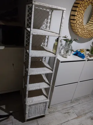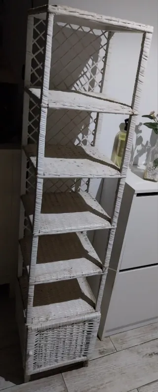 Estantería de mimbre con un diseño de rejilla en los laterales y un cesto en la parte inferior. Sus estantes son amplios y permiten organizar diversos objetos. - Tiene algun desperfecto, por eso el precio - Estructura de mimbre. - Color blanco.
