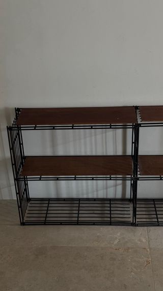 Estantería de diseño con estructura de metal y estantes de madera. Está en la caja original, por eso pongo estas fotos. - Malla de hierro de alta densidad. - Materiales robustos y gruesos. - Patas ajustables para mayor estabilidad.