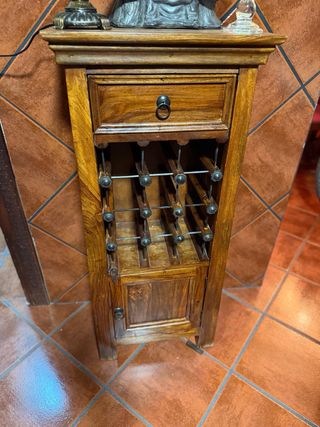 Elegante mueble botellero con un diseño práctico y funcional. - Fabricado en madera y detalles metálicos. - Dispone de un cajón superior. - Compartimento inferior con puerta.