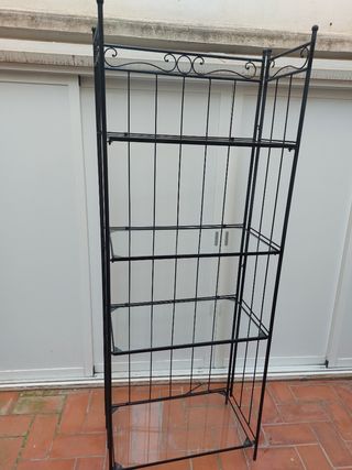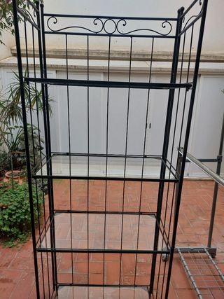 Estantería de hierro forjado negra. Estantes de cristal. Plegable. En perfecto estado.