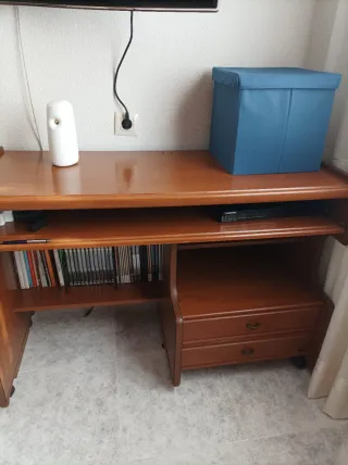 Mesa de escritorio de madera con un diseño funcional y elegante. - Amplia superficie de trabajo. - Compartimento para teclado o portátil. - Estantería para libros o decoración. - Dos cajones con tiradores. - Acabado en tono madera cálido. -