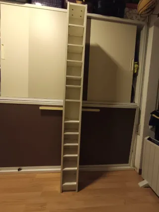 Estantería alta y estrecha, perfecta para almacenar CDs, DVDs o libros. - Diseño vertical y delgado. - Múltiples baldas para organización. - Medidas en las últimas fotos. - Con signos de uso y un roto que se muestra en la segunda foto, el cual no afecta a su funcionalidad.