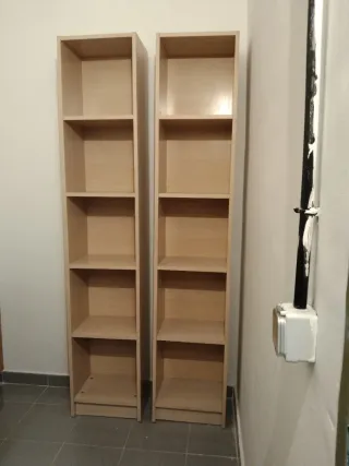 Vendo dos estanterías perfectas para organizar tus libros o decoraciones,por separado serían 20€ cada una si te llevas las dos te salen a 15€ cada una. - Diseño vertical y estrecho. - Acabado en tonos roble.