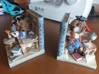 Preciosos sujeta libros de cerámica con forma de osos. Son ideales para decorar una estantería o escritorio. - Dos figuras de osos con birrete de graduación. - Representan escenas de estudio. - Están en buen estado, con detalles cuidados.