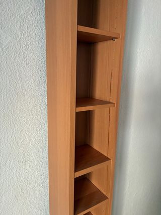 1 estanteria 25€ 2 estanterias 40€ Estantería alta de madera con cuatro baldas, perfecta para organizar tus libros o decoraciones. - Diseño vertical y estrecho. - Acabado en tonos marrones y beige.