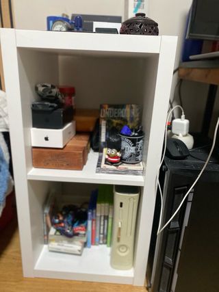 Estantería de tamaño mediano con un diseño moderno en blanco. Tiene mucho fondo para guardar lo que se quiera. Libros o cosas como yo la tengo.