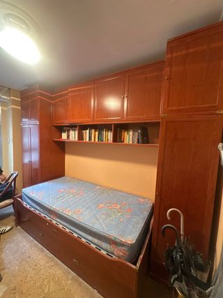 Conjunto de módulos de habitación que incluyen una cama. - Muebles de madera oscura. - Estantería superior con libros. - Cama con colchón incluido. Cama de 90, de fondo 97 - Armarios altos. Solo recogida en domicilio