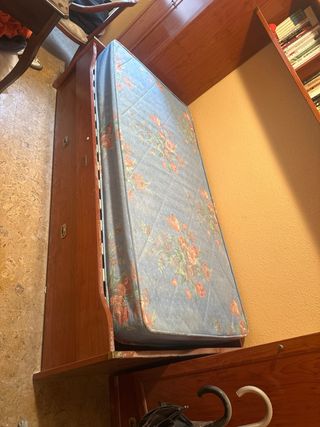 DORMITORIO compuesto por: - Cama de 90 con otra supletoria y dos cajones para organizar cosas - Sinfonier con cuatro cajones y una gaveta - Dos cubos para colgar o poner en el suelo - Un escritorio con dos cajones y una gaveta - Estanterías para libros - Una balda - Se regala colchón y colcha