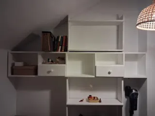 Escritorio con un diseño moderno y funcional. Una estantería grande para almacenar libros, figuras... Los diferentes estantes se pueden regular para ser más o menos altas (en la medida de las fotos está en la posición media). Debajo de la mesa hay otra estantería pequeña en vez de patas. Escritorio y estantería están unidas pero se pueden separar. Está todo como nuevo. - Superficie amplia para trabajar o estudiar. - Estructura robusta y estable. - Madera de pino Precio negociable (razonable)