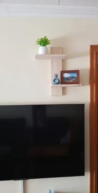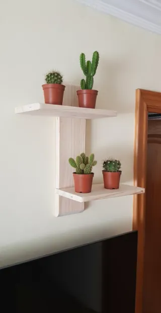 Estantería de madera con un diseño moderno y funcional. Ideal para colocar plantas o elementos decorativos. - Estructura de madera clara. - Incluye dos estantes. - Los estantes se pueden colocar en diferentes posiciones. - Decoración no incluida. Material: Pino Acabdo: Natural o Barnizado. Medidas aprox.: 46x20x18 2Kg - 12€