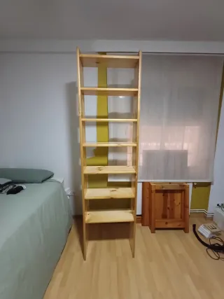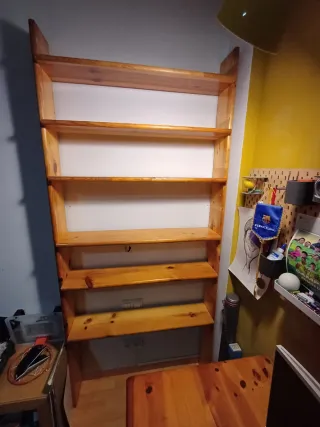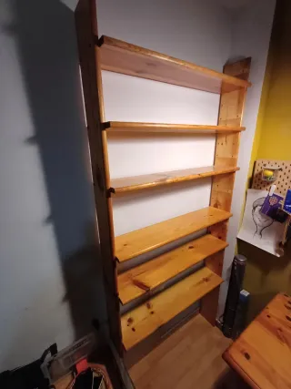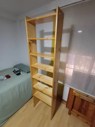 Estantería de madera de pino con gran capacidad de almacenamiento. - Seis estantes o baldas. - Diseño vertical y práctico. - Desmontado. - Muy buen estado. - Medidas: Largueros (2): Alto: 224 cm. Ancho: 23 cm. Estantes/baldas: Largo: 95 cm. Ancho: 21 cm. - No se hacen envíos. - Pago en efectivo o bizum en el momento de la entrega.