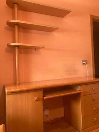 Mesa de escritorio funcional con espacio de almacenamiento. - Tres cajones para organizar tus pertenencias. - Bandeja extraíble para teclado. - Diseño en madera clara. -Estanteria de Pino maciza 7 estantes -Medida estanteria 69 ancho, 23 fondo, 155 alto