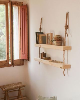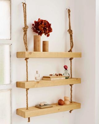 Estantería colgante de madera con cuerdas de yute. Perfecta para dar un toque rústico y natural a tu hogar. - Diseño de tres baldas. - Cuerdas de yute resistentes. - Madera de pino.