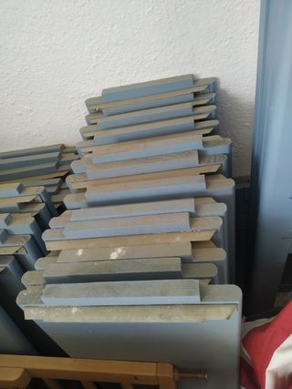 vendo estanteria por piezas madera maciza de pino pintada en azul muy fuerte puedes combinar baldas, cajones grandes, cajones pequeños o puertas precio según tipo y número de piezas Medidas costado 30*3*225 (se puede cortar por ser madera maciza) Baldas 94*28 Precio según composición Un cuerpo con siete baldas 90 euros Dos cuerpos con 14 baldas 130 euros Dos puertas 10 euros Dos cajones 10 euros