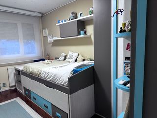 Se vende dormitorio juvenil en buen estado. Incluye armario, cama, estanterías y sinfonier - Armario de dos puertas con tiradores plateados. - Estanterías laterales de color verde. - Cama con cajones inferiores. - Paneles de armario de colores verde lima y verde. - Sinfonier de 6 cajones verdes y madera. Alguna de las baldas tiene un poco desgastada la pintura, como se aprecia en las fotos
