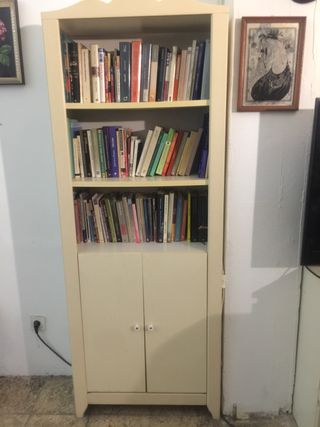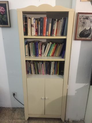 Estantería de madera lacada con dos puertecitas en la parte de abajo. Y en la parte superior tiene un reborde con redondeados de decoración.