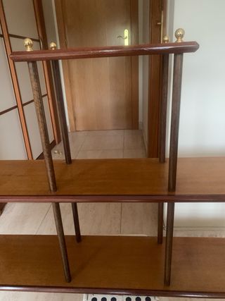 Elegante estanteria de madera color marrón. se puede colgar en la pared, como depositar en el suelo o sobre otros elementos ya que dispone de patas de cobre. Medidas: Ancho:105cm- Alto: 65cm - Fondo: 23 cm Sólo estrega en mano
