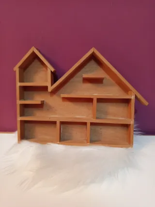 Casita de madera con varios compartimentos para exponer objetos. - Diseño de casa con tejado. - Múltiples estantes para exhibición. - Se puede pintar, barnizar al gusto.