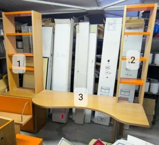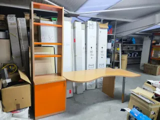 Conjunto de muebles para dormitorio juvenil, ideal para organizar el espacio. - Escritorio con diseño curvo. - Estantería lateral con baldas. - Estantería a juego. - Acabado en madera clara y detalles naranjas.