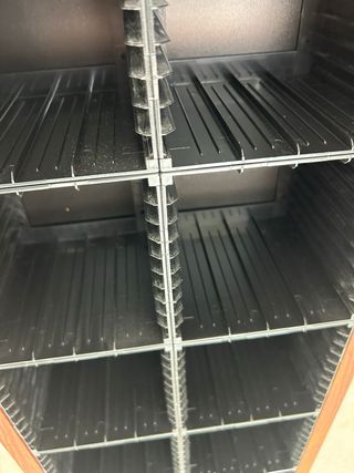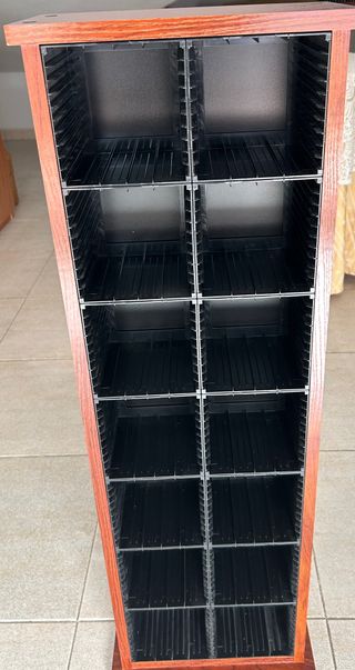 Mueble de madera con compartimentos para organizar CDs. - Estructura principal de madera. - Compartimentos interiores de plástico. - Diseño vertical para optimizar espacio.